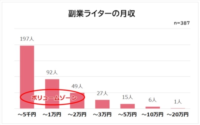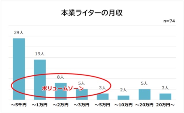 この結果から、本業・副業ライターともに、ボリュームゾーンは月1万円以下であることがわかります。